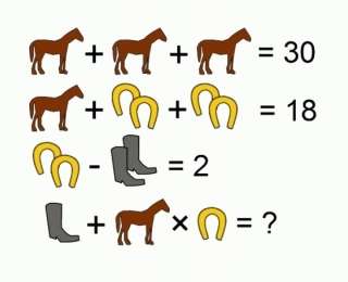 Ճիշտ պատասխանն է` 21: Դժվար չէ հասկանալ, որ մեկ ձին հավասար է տասի, զույգ նալերը` չորսի, երկարաճիտ կոշիկները` երկուսի: Մնում է ուշադիր նայել վերջին տողին և հասկանալ, որ այդ օրինակում կա միայն մեկ նալ և մեկ երկարաճիտ կոշիկ: Ստացվում է` 1+10x2: