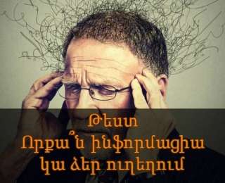 Երբևէ մտածել եք, թե որքան ինֆորմացիա կա ձեր ուղեղում: Դժվար է պատկերացնել, թե ինչպես ենք այդ ամբողջը հիշում և վերարտադրում: Երևի բոլորն են սիրում այն պահը, երբ կարողանում են ճիշտ և տեղին օգտագործել իրենց ինֆորմացիայի պաշարը: Infoman.am-ը կազմել է թեստ, որը հնարավորություն կտա չափելու, թե որքան ինֆորմացիա կա ձեր ուղեղում: