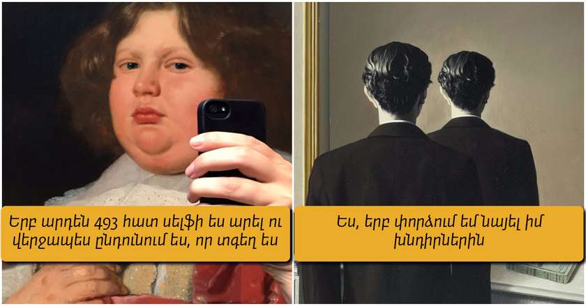 Ի՞նչ կստացվի, եթե արվեստի գործերը մեկնաբանենք այսօրվա լեզվով։ Ինչպես ցույց են տալիս այս նկարները, բավականին զվարճալի ու իրականությանը մոտ է ստացվում։