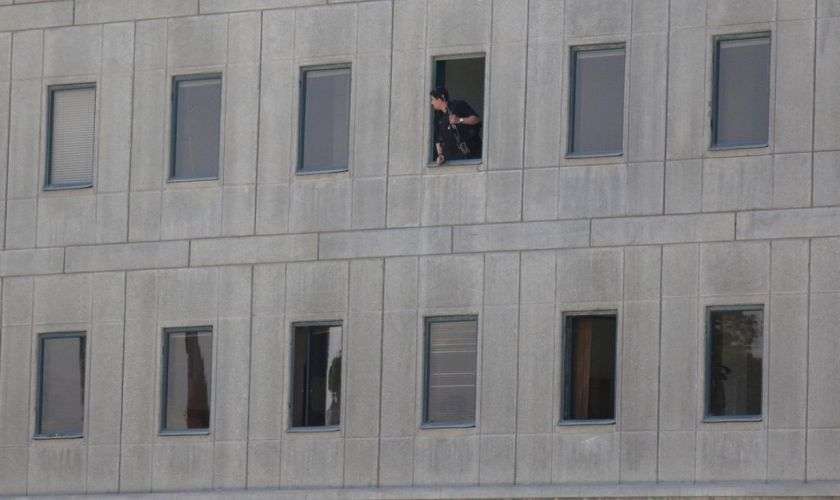 Մուտքի մոտ կանգնած անվտանգության ծառայողներից մեկը, տեսնելով ինչ-որ կապոցներ նշված երեք անձանց մոտ, կասկածել է և ցանկացել խուզարկել նրանց, որի պատճառով բախում է տեղի ունեցել և անվտանգության աշխատակիցը զոհվել է։ Մտնելով ընդունելության սրահ՝ ահաբեկիչները այստեղ սպանել են ԻԻՀ քաղաքացիական անձանց, իսկ ավելի ուշ, երբ դեպքի վայր է հասել ԻՀՊԿ հատուկ նշանակության ստորաբաժանումը, նրանք թաքնվել են նշված շենքի հարկերից մեկում, սակայն արագ ոչնչացվել ԻՀՊԿ զինծառայողների կողմից։