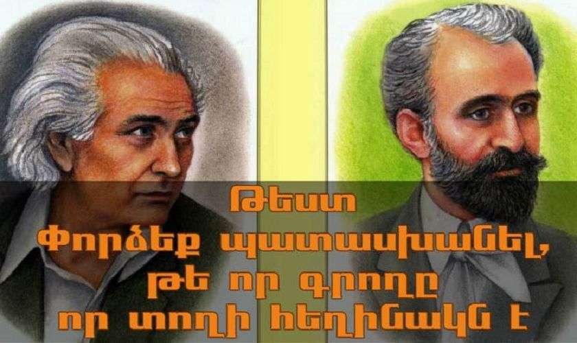 Infoman.am-ը պատրաստել է թեստ, որը շատ դուր կգա հայ գրականության սիրահարներին: Փորձեք հասկանալ, թե որ գրողը որ տողի հեղինակն է: Նյութի աղբյուր՝ http://infoman.am/tester/850-test-hay-grakanutyun-toxi-hexinak.html Կայքում տեղ գտած մտքերն ու տեսակետները հեղինակի սեփականությունն են և կարող են չհամընկնել BlogNews.am-ի խմբագրության տեսակետների հետ: print Տպել