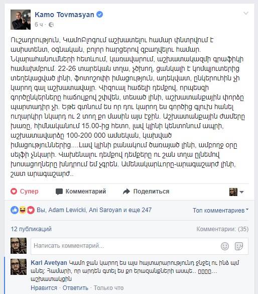 Ու վերջապես, Կամոյի ամենաթարմ բոցը փայլատակումը, որը ցնցեց համացանցը բոլորովին վերջերս։ Այն աստիճանի ցնցեց, որ հաշված ժամերի ընթացքում ֆեյսբուքյան տիրույթի ողջ պարապ ու նախանձ զանգվածն այս հայտարարությունն էր տարածում ու հումորներ անում, իսկ առավել քաջերը հենց մեկնաբանություններում էին ազատություն տալիս իրենց հումորի զգացմանը (ինչպես դա արեց փոքրիկ Կառլը)։ Ցավոք, այսպիսի մեծ ուշադրությունը բերեց անխուսափելի ու Կամոյի մոտ այդքան հաճախ հանդիպող արդյունքի․ նա հեռացրեց իր գրառումը։ Բարեբախտաբար, որոշ չար մատիկներ հասցրել էին սքրին անել ու մենք, այնուամենայնիվ, կարող ենք լիարժեք վայելել արական թրաֆիքինգի աշխատանքի այս հայտարարությունը։