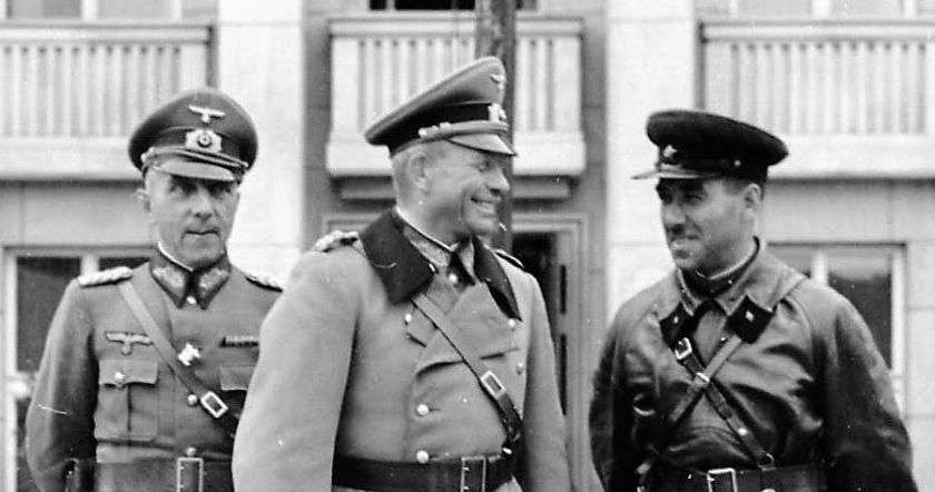 Ռուսները և նացիստները: Ավելի կոնկրետ՝ Հուդերիանը, Կրիվոշեյինը և Ֆոն Վիկտորինը համատեղ օկուպացված Լեհաստանում խորհրդագերմանական համատեղ զինվորական շքերթի ժամանակ: