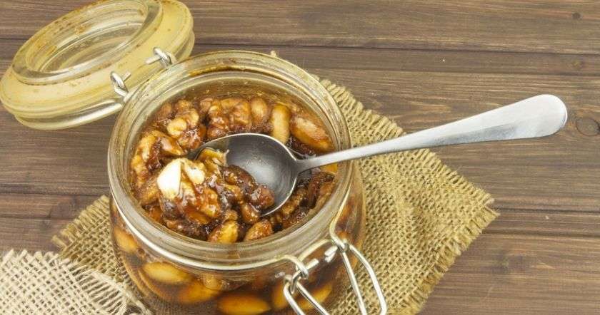 Այժմ կտրեք ընկույզները երկու հավասար մասի, դրեք տարայի մեև և լցրեք մեղր, ծածկեք կափարիչով և թողեք մեկ շաբաթ։