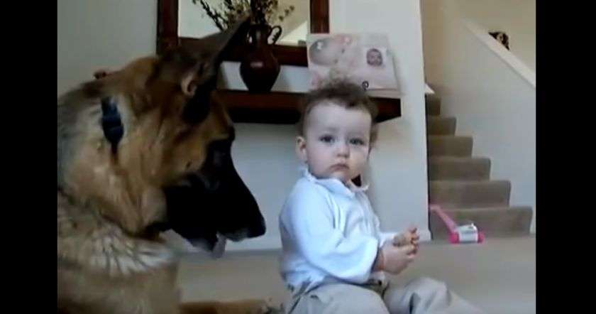 Աղջիկը վերցնում է շան դիմացից նրա ուտելիքը, իսկ շունը փորձում է առանց երեխային վնասելու վերցնել այն երեխայի ձեռքից։