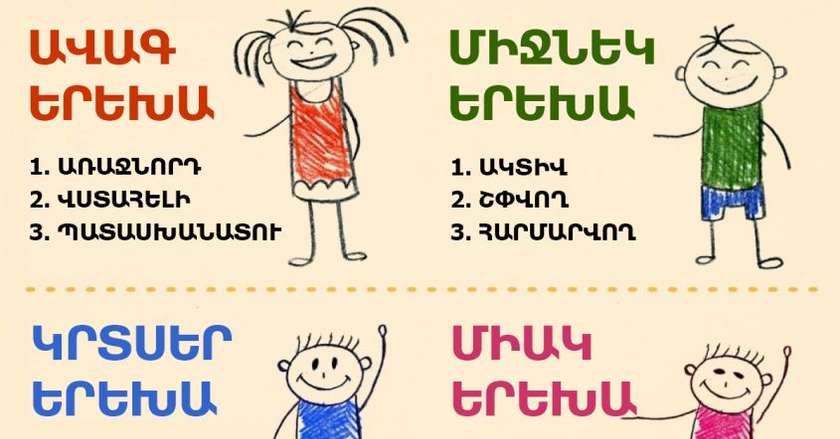 Շատերին է ծանոթ այն պնդումը, ըստ որի ավագ երեխաները ավելի պատասխանատու և ինքնուրույն են, մինչդեռ միակ երեխաները հակված են եսակենտրոնության: Սակայն քչերի գիտեն, որ սրանք պարզապես կարծրատիպեր չեն. իրականում, երեխաների ծնվելու հերթականությունն ազդում է նրանց բնավորության վրա: