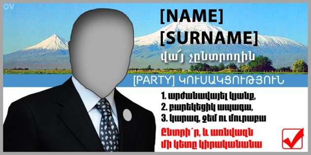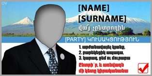 Նախընտրական պաստառի «թեմփլեյթ» եմ սարքել: Ընդունվում են կոլլեկտիվ հայտեր: Մեծամասնական թեկնածուներին՝ 5000 դր., համամասնականներին՝ զեղջեր: