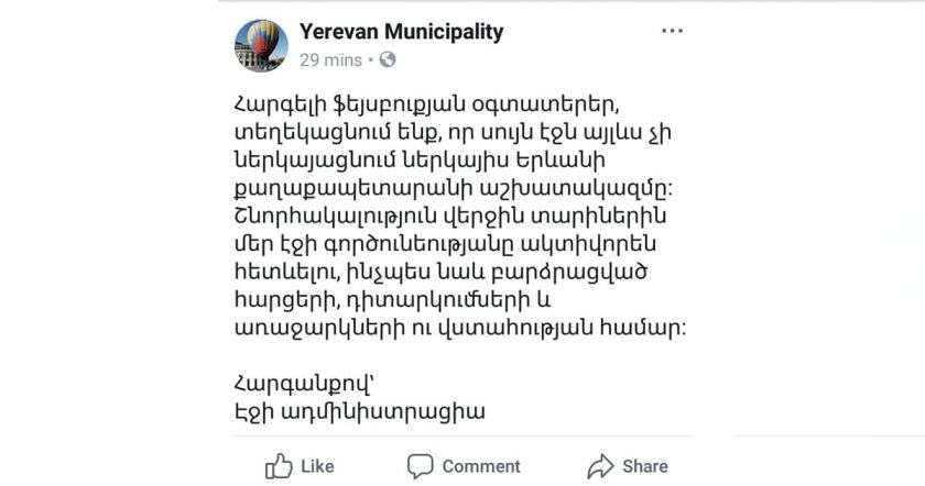 Հետո զարմանում եք՝ ինչո՞ւ է ժողովուրդը գնում Նիկոլի հետևից, ինչո՞ւ իրենց էդպես չեն սիրում... Լավ ,ինչքա՞ն մարդ պիտի ագահ լինի, ինչքա՞ն պիտի ծակաչք լինի կամ ինչքան պիտի չկամ լինի, որ նույնիսկ քաղաքապետարանի պաշտոնական էջը հետը տանի։ Լավ, էդ մի քանի հազար լայքի եղածն ի՞նչ էր, որ դա էլ վերցրիք ձեզ հետ։ Լավ, неужели բարոյականության ու քաղաքավարության տարրական կանոնները ձեզ չեն սովորեցրել, լավ, ո՞նց էլի։ Ո՞նց եք պատկերացնում՝ էս էժանագին պահվածք ցուցաբերելուց հետո ձեզ ո՞նց պիտի սիրեն ու ընկալեն։