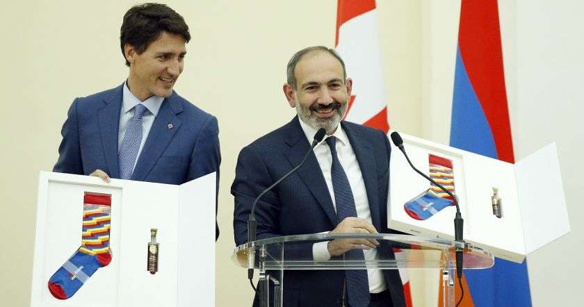Արարողակարգի համաձայն՝ երկու երկրների կառավարությունների ղեկավարները հանդես են եկել փոխադարձ բաժակաճառերով, որի ժամանակ Փաշինյանը Թրյուդոյին գուլպաներ է նվիրել: