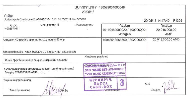 Մայիսի 29-ի դրությամբ ոստիկանության կողմից ՀՀ գյուղի և գյուղատնտեսության աջակցման հիմնադրամին է փոխանցվել ավելի քան 20 միլիոն դրամ գումար: