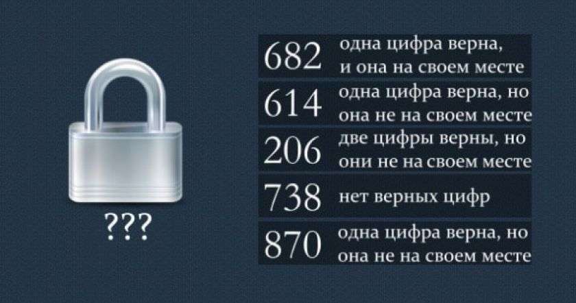 Լուսանկարում պատկերված կողպեքը պաշտպանված է երեք նիշից բաղկացած կոդով: Բազմաթիվ անգամներ փորձ է կատարվել գտնելու ճիշտ կոդը, սակայն այդպես էլ չի հաջողվել: Կարո՞ղ եք գտնել ճիշտ կոդը՝ ելնելով նախորդների թույլ տված սխալներից: