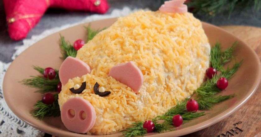Երշիկներով կամ զեյթուններով զարդարել աղցանն այնպես,որ ստացվի խոզուկ։