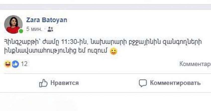 Էս աղջիկն այս տարվա հունվարի 19-ին է նշանակվել ՀՀ Աշխատանքի և սոցիալական հարցերի նախարար։ Ուղիղ մեկ ամիս է պետք սրանց նմաններին, որպեսզի կտրվեն իրականությունից, իրենց երևակայեն խիստ ծանրաբեռնված, հավակնեն պարգևավճարների ու արդյունքում ոչ մի բան չանեն։ Կարևորը աշխատանքի իմիտացիա ստեղծելն ա։ Իբր «ես էնքան զբաղված եմ, որ զանգերին պատասխանելու ժամանակ չունեմ», բայց Ֆեյսբուքում զվռնելու ժամանակ ունեն։ Աշոտյանին էին քննադատում ամբողջ օրը Ֆեյսբուքում լինելու համար, հիմա նույնը գլխներիս ա գալիս։