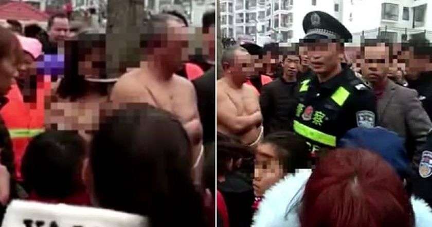 Մերկ զույգի մոտ ամբոխ է հավաքվել: Դեպքի վայրում գտնվող ոստիկանը փորձել է հանգստացնել մարդկանց, սակայն ոչինչ չի ձեռնարկել կապվածներին ազատ արձակելու համար: