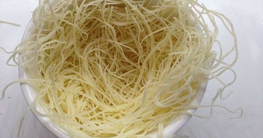Պատրաստում ենք խմորը, որի համար ձուն, ալյուրը, ջուրն ու աղը խառնում ենք։ Ալյուրն անցկացնում ենք մաղով, որպեսզի խմորի մեջ գնդիկներ չառաջանան։ Խմորը լցնում ենք հրուշակեղենային պարկի մեջ։
