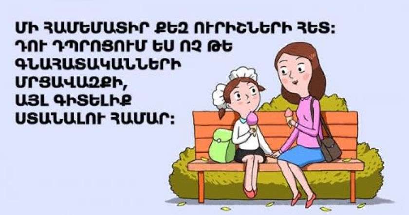 • Մի համեմատիր քեզ ուրիշների հետ։ Դու դպրոցում ես ոչ թե գնահատականների մրցավազքի, այլ գիտելիք ստանալու համար։
