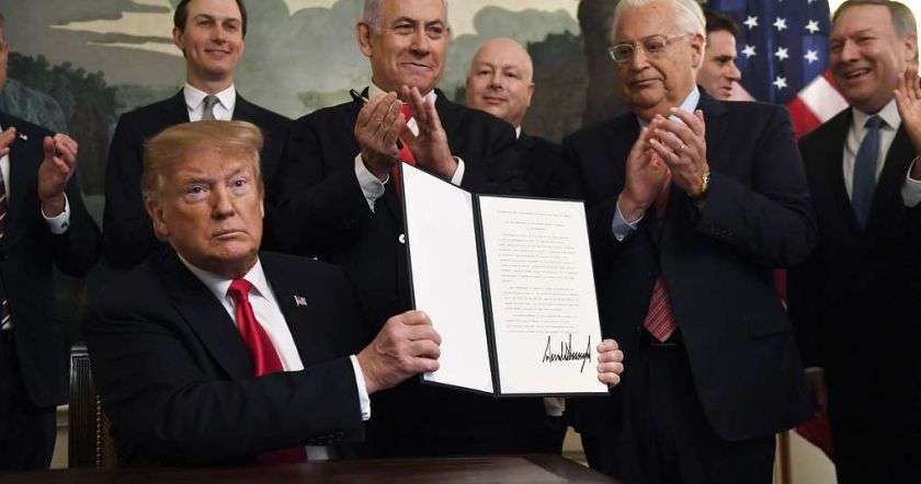 Թրամփը ստորագրեց Գոլանի բարձունքների նկատմամբ Իսրայելի սուվերենության ճանաչման մասին որոշումը։ Սիմվոլիկ էր ստորագրման արարողությանն Իսրայելի վարչապետ Նեթանյահուի մասնակցությունը, ով չէր կարողանում զսպել իր հիացմունքը։ Արարողակարգին ներկա էր նաև Թրամփի ավագ խորհրդական Ջերարդ Քուշները, ով զգալի դեր է ունեցել վերջին շրջանում ԱՄՆ-Իսրայել հարաբերությունների զարգացման գործում։