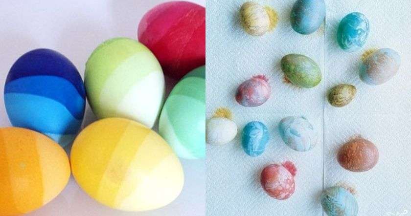 Սկզբում ձվերը ներկեք բաց երանգների գույներով, հետո ներկված ձուն թաթախեք ավելի մուգ երանգի գույնի մեջ՝ նախօրոք դրան խառնելով 1 թեյի գդալ ձեթ: Արդյունքը շատ գեղեցիկ է․
