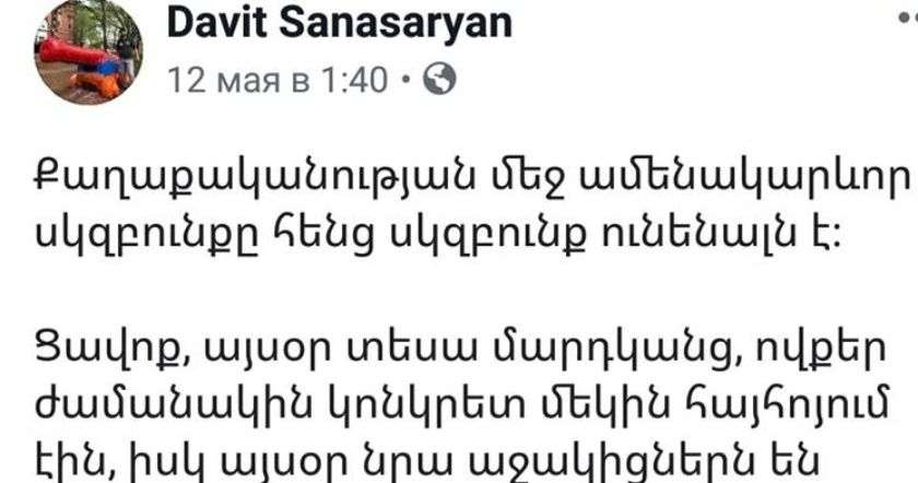 Սա գրել է մի մարդ, ով բուկվալնը մի քանի ամիս առաջ Ժառանգությունից թռավ ՔՊ գիրկը։ Ով բուկվալնը մի քանի ամիս առաջ խոսում էր կոռուպցիայի անթույլատրելիության մասին ու հիմա մեղադրվում է կոռուպցիոն սխեմայի մաս կազմելու մեջ։ Մեկը, ով նախկին վարչապետի ժիլետից էր նեղվում, խրտվիլակ սարքում ու մի քանի ամիս անց 3 միլիոնանոց Stefano Ricci հագավ։ Ի վերջո հերիք է էլի ՀՀԿ-ի բաներից կախվեք։ ՀՀԿ-ից առնվազն 20 հոգի գիտեմ, որ ձեր պես շատ շատերից հազար անգամ ավելի արժանավոր տղերք են։