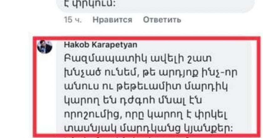 Պարոն Կարապետյան, դուք կարաք խնչեք ձեր տնեցիների, ձեր հարազատների, ախպեր-ընկերների կարծիքի վրա, բայց ոչ նման հիմարագույն գաղափարի պաշտպանության համար անցնել սահմաններն ու նման արտահայտություններ թույլ տալ էն նույն հարկատուների հասցեին, ովքեր համամիտ չեն ձեր կոմիկ շեֆի երկնած ամեն տխմար գաղափարի հետ: