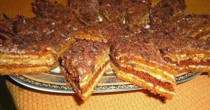 Հարմար ափսեի կամ սկուտեղի վրա դրեք առաջին շերտը՝ հակառակ կողմով, հանեք յուղաթուղթը, քսեք կրեմը, վրան դրեք մյուս շերտը, լավ սեղմեք, նոր հանեք յուղաթուղթը, քսեք կրեմը, ապա հաջորդ շերտը, կրկին լավ սեղմեք, հանեք յուղաթուղթը, քսեք կրեմը և այդպես բոլոր շերտերը: