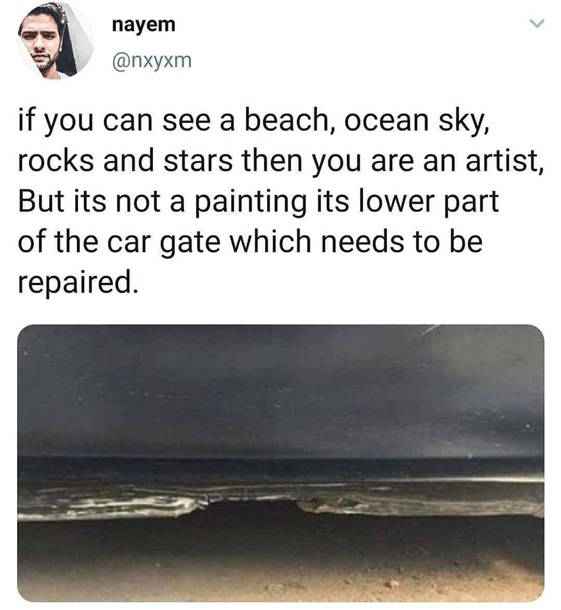 Նկարի մեկնաբանությունում տղամարդը գրել է. «Եթե դուք տեսնում եք լողափ, երկինք՝ օվկիանոսի վերևում, քարեր և աստղեր, ապա դուք նկարիչ եք, սակայն սա նկար չէ»: Օգտատերը նաև բացատրել է, որ դա ավտոտնակի դարպասների ստորին հատվածն է, որը վերանորոգման կարիք ունի: