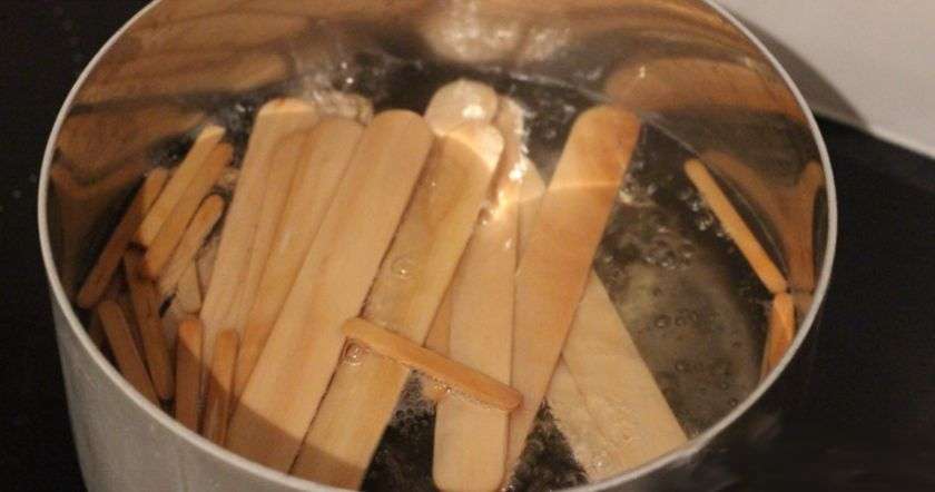 Նախևառաջ, փայտիկները պետք է դնել եռացող ջրով կաթսայի մեջ, ապա դրանք պետք է դնել փոքրիկ տարաների մեջ, ինչպես ցուցադրված է նկարում: Թողեք դրանք արևի տակ ամբողջ օրը: