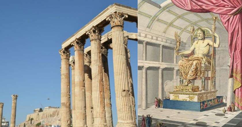 Օլիմպիական խաղերի անցկացման քաղաքում պետք է վեր խոյանար մարմարե տաճար՝ հին հունական գլխավոր աստծու պատվին։ Ներսում գտնվում էր փղոսկրից պատրաստված և 12-17 մ բարձրություն ունեցող Զևսի արձանը։ Հուշարձանի զարդարման համար օգտագործվել է 200 կգ մաքուր ոսկի։ Զևսի աջ ձեռքին կանգնած էր հաղթանակի աստվածուհի Նիկեն, ով նրա մշտական ուղեկիցն էր, ձախ ձեռքին գայիսոնն էր, որի վրա կանգնած էր արծիվը, ինչը խորհրդանշում էր նրա հզորությունը։ Աջ կողքին կանգնած էին 3 աստվածուհի քույրերը՝ Եվփռոսինեն, Թալիան, Ագլայիան, ովքեր Զևսի և Եվրինոմեի դուստրերն էին։ Գլուխը, կուրծքը, ձեռքերը, ուսերը փղոսկրից էին, թիկնոցն ու մազերը՝ ոսկուց։ Զևսի արձանը կործանվել է մեր թվարկության 394թ․։ Նրա որոշ մասեր փրկվել են ու տեղափոխվել Կոստանդնուպոլիս։