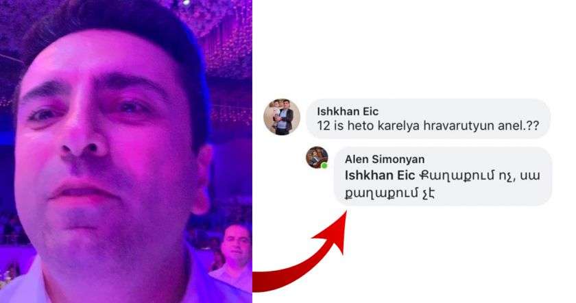 Խաչատուր Սուքիասիանի որդու և Գագիկ Ծառուկյանի դստեր հարսանիքը շատ թեժ է անցել, և կասկած ունեմ, որ խմիչքը լցնում էր միշտ ինչ-որ մի բանը կորցրած փոխթաղապետ Արամ Մանուկյանը, քանի որ հարսանեկան դահլիճից անընդհատ ինչ-որ բաներ էին հրապարակվում, ապա՝ արագ հեռացվում համացանցից․ սկզբում՝ Փաշինյանների աղջկա սելֆիները սանհանգույցից, որոնք հեռացվեցին, և Ալեն Սիմոնյանի այս մեկնաբանությունը, որին ուզում եմ անդրադառնալ։