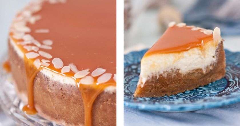 Պատրաստում ենք կարամելային սոուսը: Շաքարավազը լցնում ենք կաթսայի մեջ, դնում կրակին: Փայտյա թիակով խառնում ենք, մինչև շաքարավազը հալչի ու դառնա ոսկեգույն: Հալեցրած կարագը լցնում ենք շաքարավազի մեջ: Երբ խառնուրդը սկսում է խտանալ, լցնում ենք տաք սերուցքը: Կարամելը մի քիչ տաքացնում ենք, հովացնում մինչև 45-50 աստիճան ու լցնում չիզքեյքի վրա: Բարակ շերտով հավասարեցնում ենք, որպեսզի ստացվի ջնարակ, ոչ թե հաստ շերտ: 30 րոպե թողնում ենք սենյակային ջերմաստիճանում, որպեսզի հովանա, ինչից հետո ողջ գիշեր պահում ենք սառնարանում: