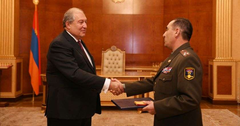 Նախագահական նստավայրում Արմեն Սարգսյանն այսօր ընդունել է պաշտպանության նախարար Դավիթ Տոնոյանին և Արմեն Հարությունյանին: Շնորհավորելով վերջինիս զինվորական բարձր կոչմանն արժանանալու համար և հետագա հաջողություններ ու բարի ծառայություն մաղթելով՝ նախագահը մասնավորապես ասել է. «Այնքան լավ պաշտպանեք մեր երկրի սահմանները, որ որևէ մեկի մտքով չանցնի նույնիսկ ամենափոքր գործողություն սկսել»: