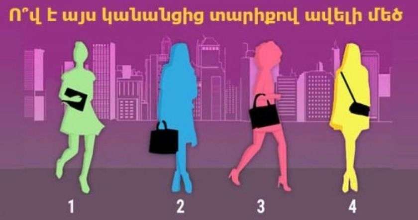 Ներկայացնում ենք մի պարզ թեստ, որի ընթացքում դուք պետք է ընտրեք համարը, որի ներքո, ըստ ձեզ, պատկերված է այս 4 կանանցից ամենատարեցը: Ձեր պատասխանը շատ բան կպատմի ձեր մասին: