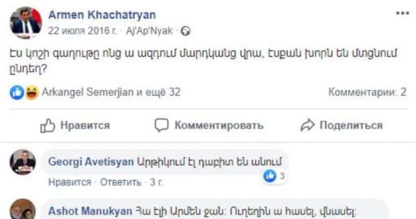 Հ․Գ․ Սա դնում եմ, որպեսզի բոլորի համար հասկանալի լինի, թե որքան անարժեք է լևոնականների գովքը Նիկոլի մասին, ու որքան ցածր կարող են նրանք իջնել։ Պատկերացնո՞ւմ եք, եթե այսօր Փաշինյանին քննադատողները այսքան իջած լինեին․․․