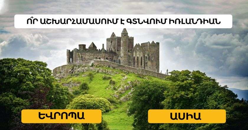 Մենք պատրաստել ենք Ձեզ համար ընդհանուր գիտելիքներին վերաբերող շատ հետաքրքիր թեստ: Հարցերը շատ հեշտ են, և կարելի է հեշտ և հաճույքով անցնել այն և համոզվել, որ դուք բավական լավ գիտելիք և հիշողություն ունեք: Այնպես որ, եթե չգիտեք՝ ինչով զբաղվել հիմա, համարձակ ընտրեք մեր թեստը, հավաքվեք մտքերով և անցեք այն, իսկ մենք վերջում ցույց կտանք արդյունքները: