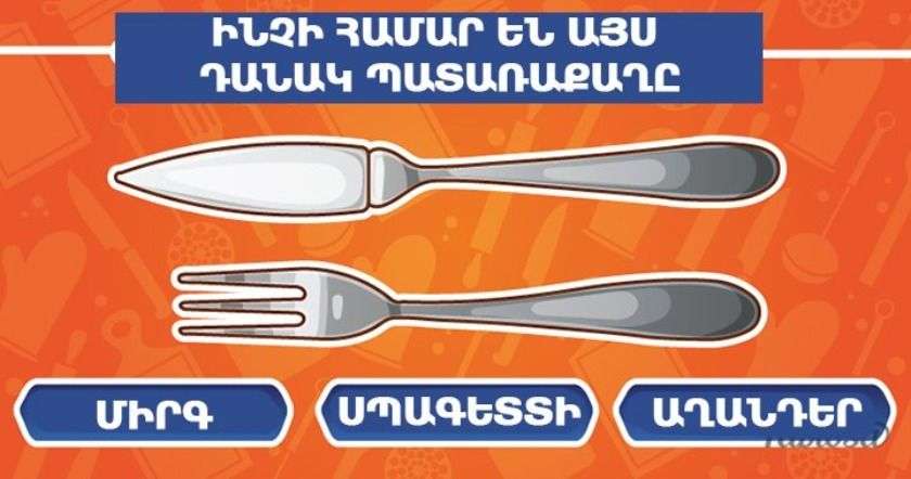 Առաջարկում ենք անցնել մի փոքրիկ թեստ, պարզելու համար, թե որքանով եք ճիշտ կարողանում պահել ձեզ սեղանի շուրջ։ Կարողանու՞մ եք արդյոք ճիշտ օգտագործել սպասքը, թե ոչ։