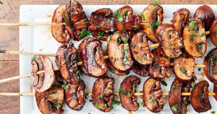 3. Փակել տոպրակը, թափահարել և թողնել 30 րոպե: Խորովածի փայտիկները թրջել և շարել մարինացված սունկը: