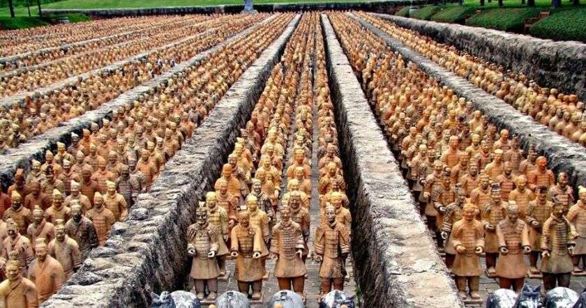 Նկարում պատկերված է Չինաստանի պատմության ամենահայտնի պատմական, ճարտարապետական և մշակութային հուշահամալիրներից մեկը՝ հայտնի «Տերակոտե բանակը»: Մոտ 8 հազար զինվորների արձաններից բաղկացած այս հուշահամալիրը գտնվում է Ցին դինաստիայի կայսր Շիխուանդի դամբարանի մոտ: Կայսեր ցանկությամբ կավից կառուցված այս զինվորները պետք է իրեն ուղեկցեին մահվանից հետո: Այս հրաշքը կառուցվել է Մ.Թ.Ա 3-րդ դարում և մոտավորապես 2200 տարեկան է: ԱՄՆ նախագահ Ռեյգանը չէր կարողացել զսպել իր հիացմունքը և այն անվանել էր «Մեծ հրաշք որը պատկանում է մարդկությանը»: