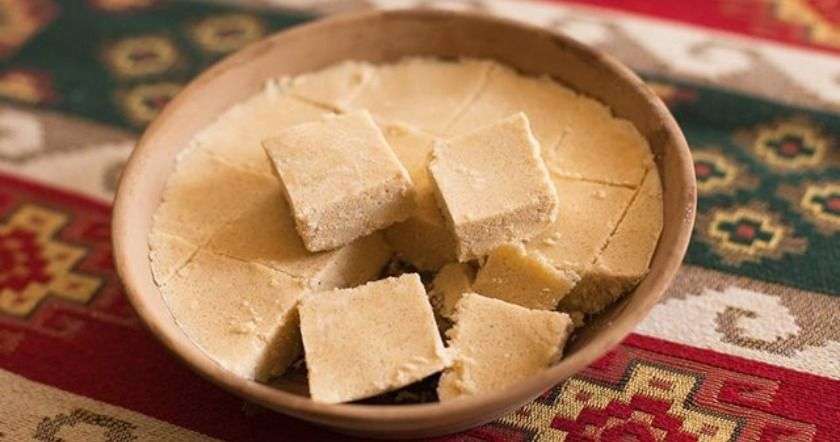 Ալյուրը թեթևակի բովել: Ավելացնել յուղը և տրորել: Անջատել կրակը և լցնել շաքարավազը: Տափակացնել ափսեի մեջ, դանակով խորանարդների վերածել: