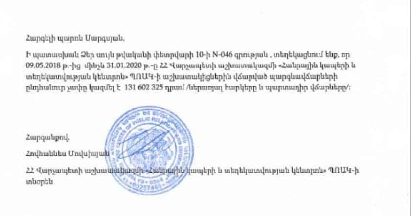 Ստացված գրավոր պատասխանից (կցվում է) տեղեկանում ենք, որ Փաշինյանի օրոք ՀՀ վարչապետի աշխատակազմի «Հանրային կապերի եվ տեղեկատվության կենտրոն» ՊՈԱԿ-ի աշխատակիցներին վճարված պարգևավճարների ընդհանուր չափը կազմել է 131.602.325 դրամ (շուրջ 276 հազար դոլար):