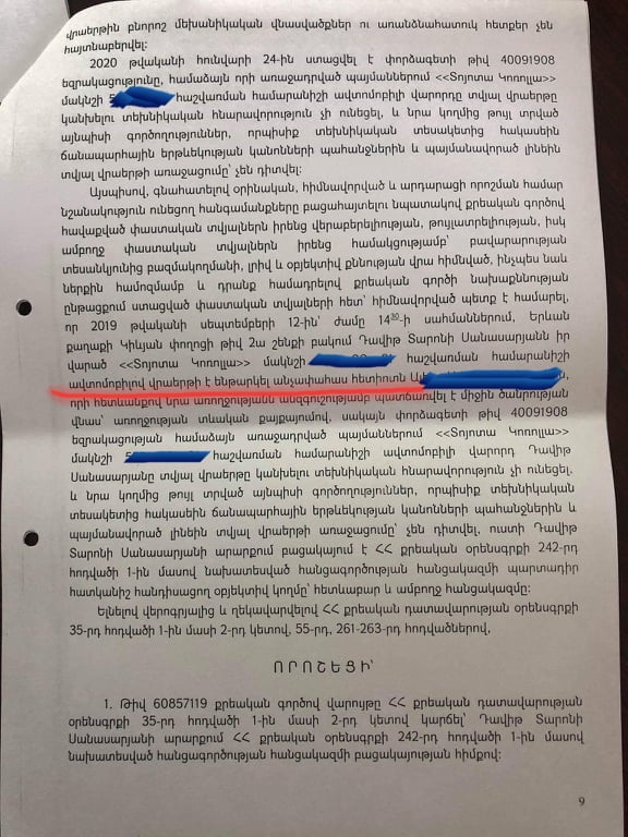 ՀՀ ՊՎԾ լիազորությունները կասեցված ղեկավար պ-ն Դ.Սանասարյանի կողմից անչափահասին վրաերթի ենթարկելու վերաբերյալ քրեական գործը կարճելու մասին որոշման եզրափակիչ մասն է, որտեղ հստակ գրված է, որ նա անչափահասին վրաերթի է ենթարկել և պատճառել միջին ծանրության մարմնական վնասվածքներ: Եկեք ընդունենք, որ քիչ հավանական է, որ երեխան անզգուշությամբ ավտոմեքենային դիպչելիս ստանար նման կարգի մարմնական վնասվածքներ: