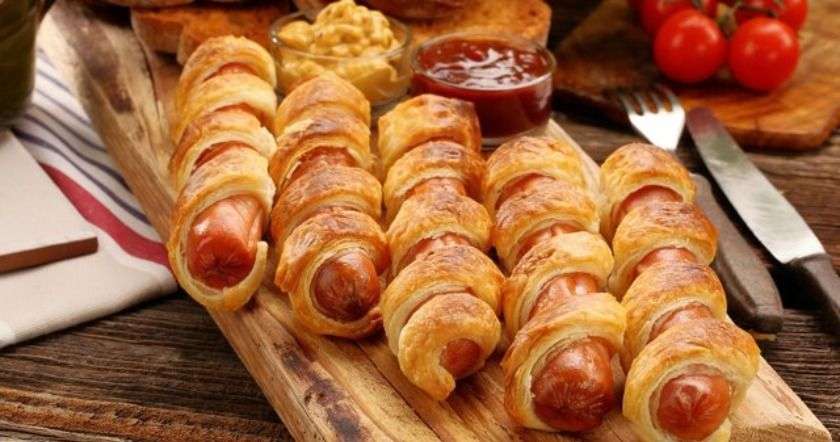 3. Նրբերշիկները փաթաթել խմորի շերտերով, շարել յուղաթղթով պատված տապակի մեջ: