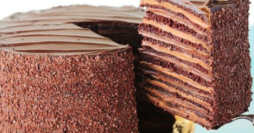 1. Սոդան ավելացնել կեֆիրին և լավ խառնել: Ավելացնել ձվերը և շաքարավազը, կրկին խառնել: Լցնել մաղած ալյուրը, փխրեցուցիչը և կակաոն: Լավ խառնել: Խմորը պետք է լինի ավելի խիտ, քան թթվասերը: Տապակի մեջ բարակ շերտեր թխել (7 շերտ):