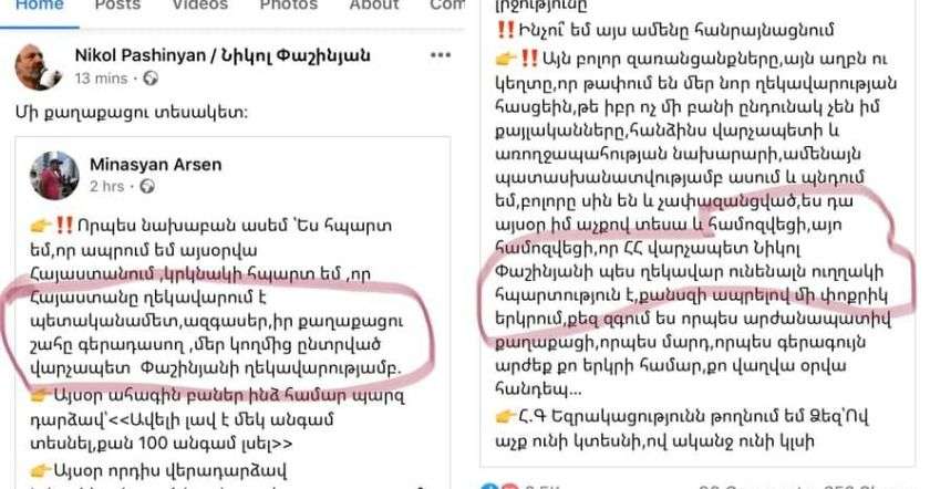 Մարդ որքա՜ն անբարոյական պիտի լինի, ինքն իրեն ներքուստ որքա՜ն անպետք պիտի զգա, թերարժեքության ինչպիսի՜ անհաղթահարելի բարդույթով պիտի տառապի, որ, լինելով երկրի ամենաբարձր պաշտոնյան, ֆեյք օգտատիրոջ բերանով ինքն իրեն մեծարող լպրծուն նման խոսքեր տարածի: