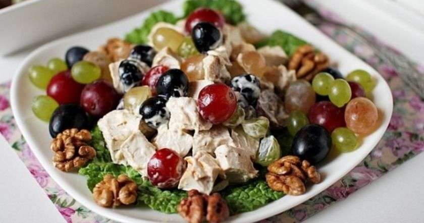 - Աղցանը ծածկել պանրի շերտով (առանց մայոնեզի), շարել խաղողները, կրկին պանիր ցանել: