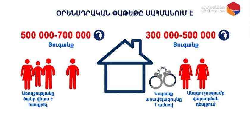 Կորոնավիրուսով վարակելու, ինչպես նաեւ մեկուսացման կամ ինքնամեկուսացման պահանջները խախտելու դեպքում քաղաքացիները կենթարկվեն վարչական կամ քրեական պատասխանատվության։