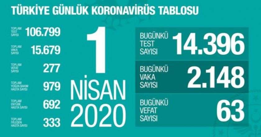 Թուրքիայում ապրիլի 1-ի դրությամբ նոր տեսակի կորոնավիրուսից (Covid-19) մահացել է ևս 63 մարդ։ Այս մասին Twitter միկրոբլոգի իր պաշտոնական էջում հայտնել է Թուրքիայի առողջապահության նախարար Ֆահրեթթին Քոջան։