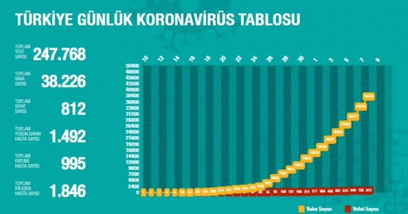Այսպիսով, ըստ վերջին տվյալների, Թուրքիայում արձանագրվել է կորոնավիրուսով վարակվելու 38․226 հաստատված դեպք և մահվան 812 դեպք։ Ընդհանուր առմամբ կատարվել է 247․768 թեստավորում։