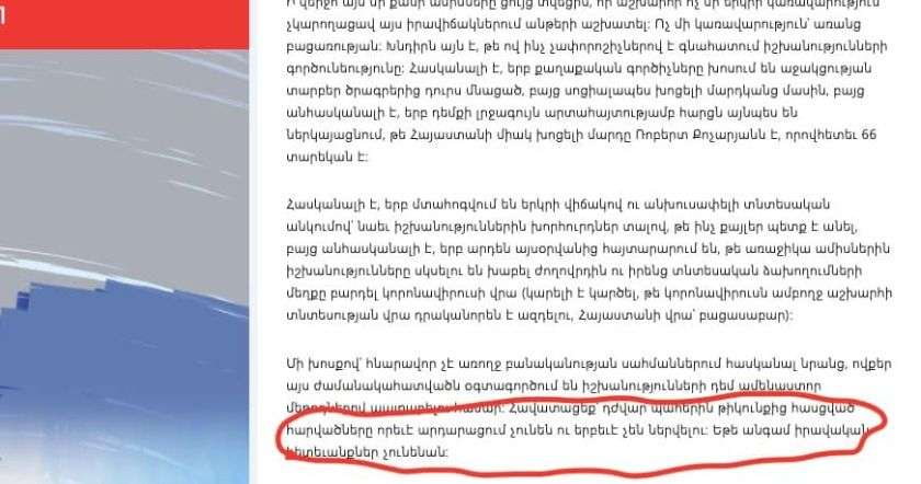 Այսինքն, եթե արձանագրենք իշխանության սիրելի բառապաշարով- որո՞նք են լինելու ոչ իրավական հետևանքները` վնգստոցը, պադվալ առ պադվալ հաշվեհարդարը, թե հոդվածագիրը այլ բան նկատի ուներ: