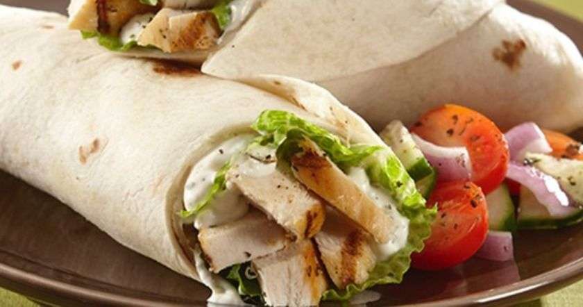 2. Լավաշի վրա դնել հազարի թերթիկները, օղակաձև կտրատված վարունգը և լոլիկը, հավի կտորները, սոխ և կանաչի: