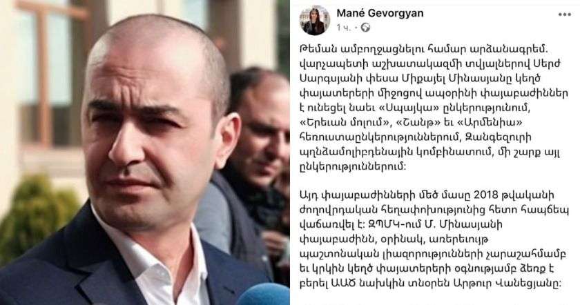 Հ.Գ. Ձեր հաջորդ գրառման մեջ առաջարկում եմ նշել, որ Միքայել Մինասյանը բաժնեմաս ունի «Հայկական ժամանակ» օրաթերթում և «Իմ քայլը» հիմնադրամում։
